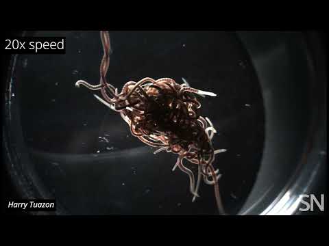 Found in ponds and other standing water, California blackworms (Lumbriculus variegatus) interlace themselves into clumps to control their temperature or conserve moisture (SN: 1/11/19). The worms are typically just a few centimeters long. Their clumps, which can contain anywhere from 5 to 50,000 worms, take minutes to weave. But when spooked by a potential predator, the worms are outta there in an instant.
